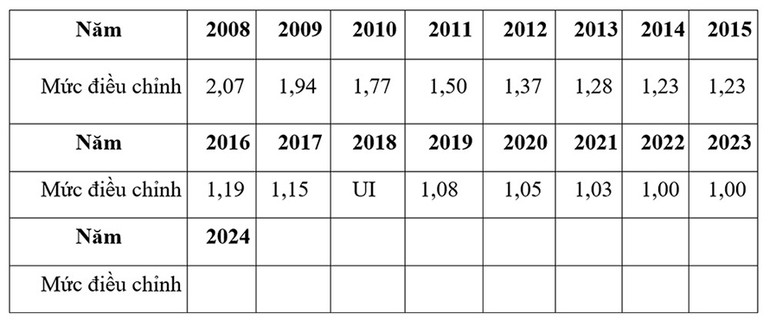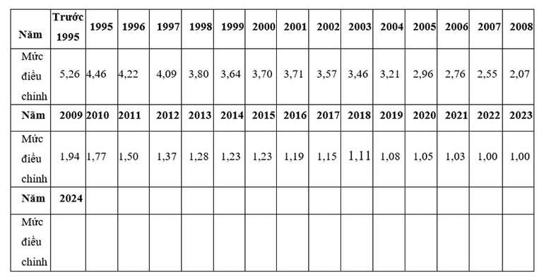 Trong đó, mức điều chỉnh tiền lương đã đóng bảo hiểm xã hội của năm tương ứng được thực hiện theo Bảng 1 dưới đây: