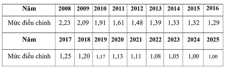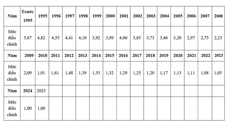 Trong đó, mức điều chỉnh tiền lương đã đóng bảo hiểm xã hội của năm tương ứng được thực hiện theo Bảng 1 dưới đây: