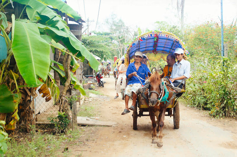 Du khách còn được tham quan một vòng đường làng bằng xe ngựa, một hình thức trải nghiệm chỉ có ở cồn Lân.