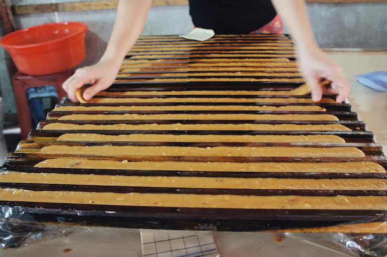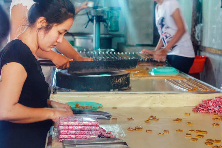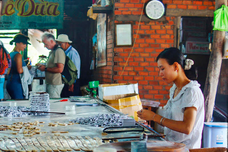 Cận cảnh bên trong một xưởng sản xuất kẹo dừa truyền thống. Ngoài thưởng thức kẹo, mua các sản phẩm về làm quà, du khách còn được tìm hiểu quy trình sản xuất kẹo dừa tại đây, một điều rất hấp dẫn du khách, đặc biệt là du khách quốc tế.