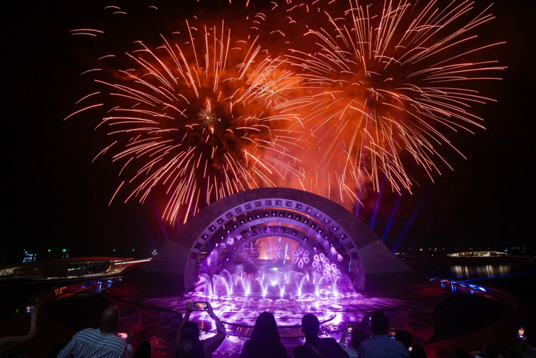 Chẳng cần chờ đến Tết, bất cứ khi nào tới Phú Quốc, du khách sẽ được đắm chìm trong bữa tiệc của công nghệ, trình diễn và âm nhạc cùng pháo hoa nghệ thuật rực rỡ cùng tại sân khấu Kiss of The Sea - Nụ hôn của Biển cả vào 21 giờ hằng ngày (trừ thứ Ba).