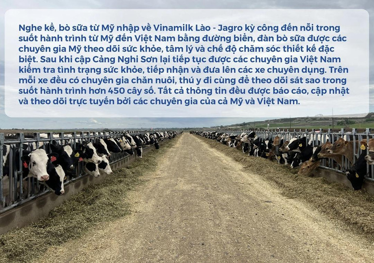 Tháng 7/2022 có thể coi là sự kiện trọng đại của dự án khi phía Vinamilk đã tiếp nhận thành công 1.000 bò sữa HF thuần chủng nhập khẩu trực tiếp từ Mỹ về Cảng Nghi Sơn (Thanh Hóa) sau đó theo đường bộ “vượt biên” qua cửa khẩu quốc tế Nậm Cắn về Trang trại Vinamilk Lào - Jagro. Đây là đàn bò sữa thuần chủng HF, đã được các chuyên gia di truyền chọn lọc kỹ càng qua lý lịch phả hệ 3 đời, bò tơ độ tuổi từ 9 đến 13 tháng. Mỗi cá thể bò đều được kiểm tra, đánh giá về chỉ số tổng hiệu suất di truyền đều ở mức cao. Bò được chọn lọc trong đàn có sản lượng trung bình trên 10.000 lít/con/chu kỳ 305 ngày, tương đương 38 - 40 lít sữa mỗi ngày.