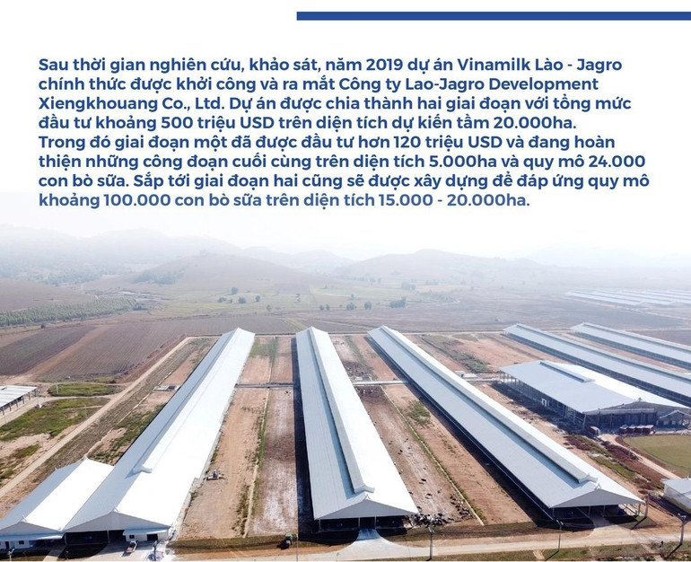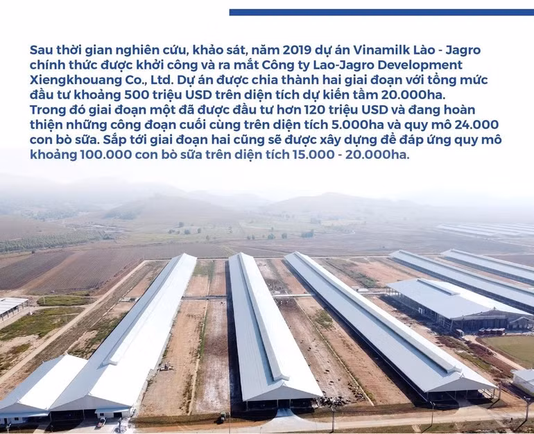Vậy mà bây giờ đã là tổ hợp resort Vinamilk Lào - Jagro hoàn thiện, có quy mô khép kín, lớn và hiện đại nhất Đông Nam Á. Sau ba năm kể từ ngày khởi công dự án, tất cả những hạng mục chính của dự án đã được hoàn thành. Đó là hệ thống chuồng bò vắt sữa quy mô 4.000 con, nhà vắt sữa có thể vắt cùng lúc 120 con bò. Dàn xoay Rotary vắt sữa mới nhất, hiện đại nhất áp dụng trong công nghệ chăn nuôi bò sữa. Hệ thống theo dõi sức khỏe, áp dụng máy móc hiện đại nhất bao gồm hệ thống tưới Center Pivot, máy móc thiết bị đảm bảo chuỗi canh tác diện tích cỏ, ngô, yến mạch từ 30 - 35 ha/ngày…