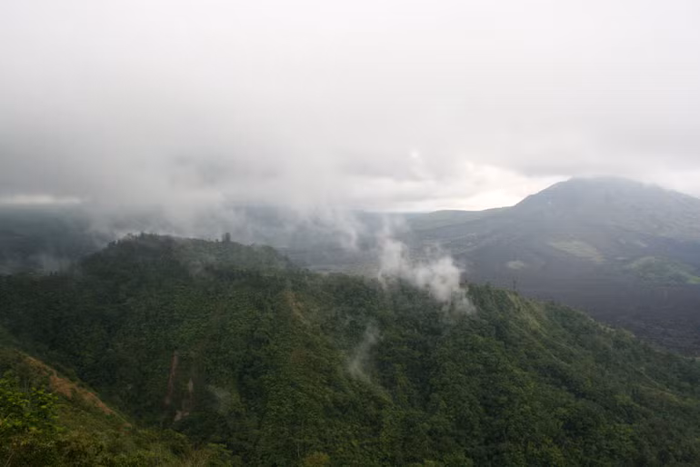 Vào những ngày trời nắng, xanh trong, ngọn núi hùng vĩ nổi bật trên nền trời xanh thẫm. Đan xen trên triền núi là màu xanh mướt mát của cây và những mảng đất đen của tro nham thạch vẫn còn lại sau những đợt phun trào từ lâu. Đâu đó trên triền núi, vẫn có những cột khói bốc lên. Người lái xe kiêm hướng dẫn viên của chúng tôi cho biết, sườn núi vẫn còn những chỗ có nhiệt độ khá cao, chính là những vị trí khói bốc nghi ngút. Những vận động viên leo núi hoặc khách du lịch muốn ngắm bình minh trên đỉnh Batur vẫn đào hố dọc đường đi để làm chín trứng hoặc làm nóng thức ăn…