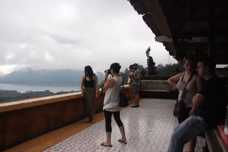 Chúng tôi dừng chân tại một điểm ngắm cảnh đối diện với Batur, nhìn chếch ra hồ nước. Nơi đây vừa là nhà hàng, quán cà phê, bán đồ lưu niệm cùng sản vật Bali. Ở đây có một dãy hành lang rộng, dài chạy tít tắp phía sau để mọi người có thể đứng ngắm và chụp ảnh.
