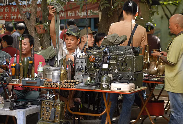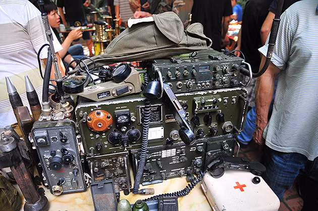 Một gian hàng quân dụng cũ tại chợ. Ở đây bày bán đủ loại trang thiết bị thời chiến tranh như máy thu phát sóng vô tuyến điện, vỏ đạn các kích cỡ, bi-đông, ca-men, túi cứu thương.
