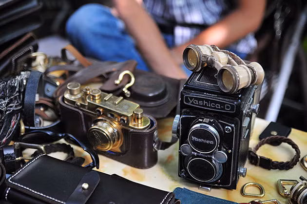 Hai kiệt tác của công nghệ nhiếp ảnh thế kỷ trước: Leica và Yashica-D. Cả hai chiếc máy ảnh này cổ đều được giữ gìn rất cẩn thận, vẫn còn đầy đủ phụ kiện như hộp đựng bằng da, nắp ống kính.