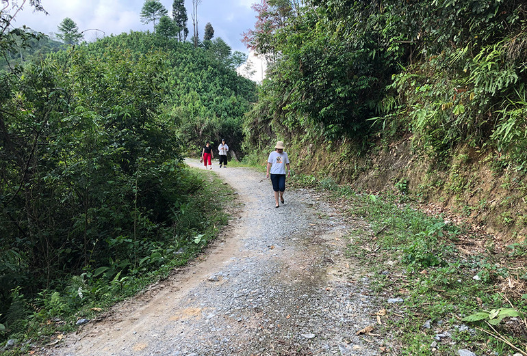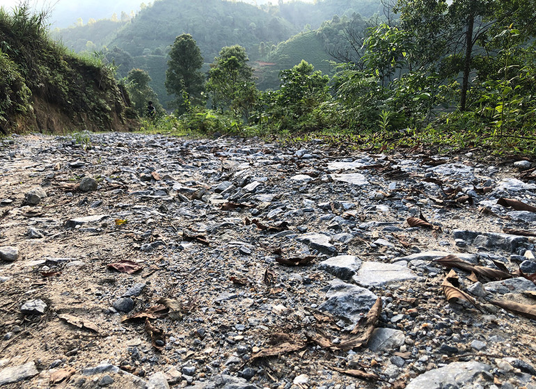 Con đường dài gần 3km chỉ toàn đá dăm, đá hộc, đường đất sâu hoắm rãnh bánh xe và những con dốc lên dốc xuống nối tiếp nhau.