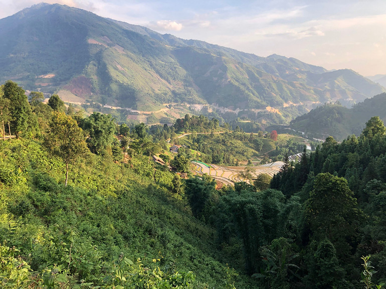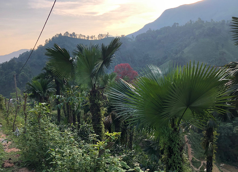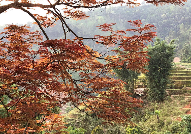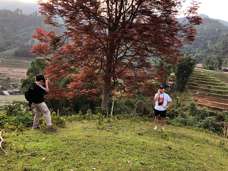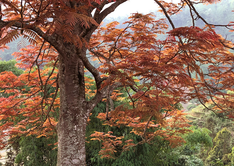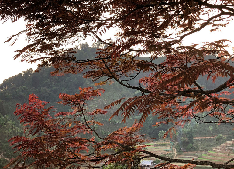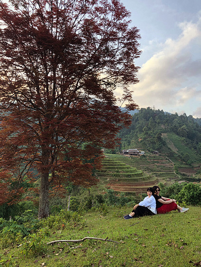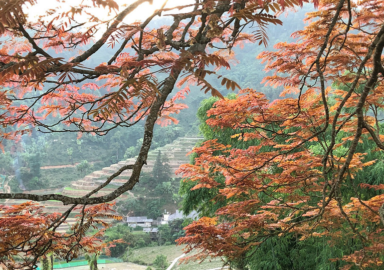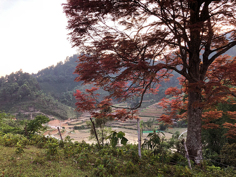 Và ở cuối con đường, tán lá đỏ rực rỡ dưới ánh hoàng hôn từ phía mặt trời đang xuống dần bên kia núi quả là một phần thưởng xứng đáng cho công sức đi bộ gần 3km đường dốc của những vị khách háo hức vốn chỉ quen với xe máy và phố phường.