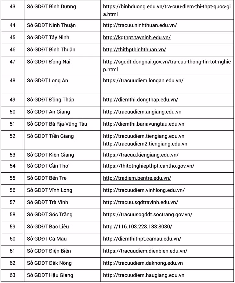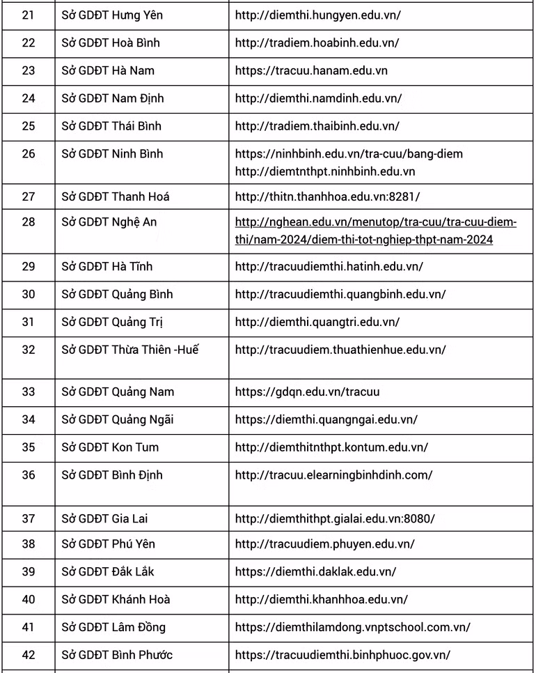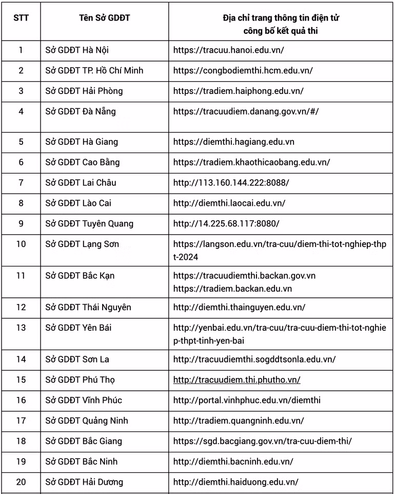 Danh sách địa chỉ tra cứu điểm thi tốt nghiệp THPT năm 2024 qua trang thông tin của Sở Giáo dục và Đào tạo tỉnh, thành phố như sau: