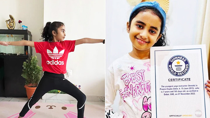 Một bé gái bảy tuổi ở Ấn Độ đã được Liên đoàn Yoga Ấn Độ chứng nhận là giáo viên yoga sau khi hoàn thành khóa đào tạo kéo dài 200 giờ. Theo AP, bé gái Praanvi Gupta (trong ảnh) cũng được xác nhận là nữ huấn luyện viên yoga trẻ nhất thế giới. Gupta đã bắt đầu tập yoga cùng mẹ khi mới ba tuổi rưỡi và thực hiện được những động tác kỹ thuật phức tạp của bộ môn yoga.