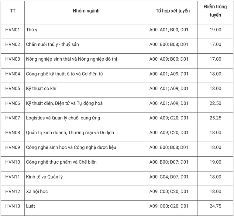Sáng 18/8, Học viện Nông nghiệp Việt Nam công bố điểm chuẩn trúng tuyển đại học chính quy xét tuyển theo kết quả thi tốt nghiệp THPT năm 2024. Điểm chuẩn cụ thể của từng ngành như sau: