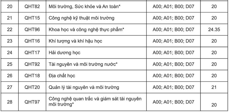 Điểm chuẩn của Trường đại học Khoa học tự nhiên được tính là tổng điểm của 3 bài thi (theo tổ hợp tương ứng) cộng với điểm ưu tiên theo khu vực, đối tượng (nếu có) và áp dụng cho tất cả các tổ hợp của ngành.