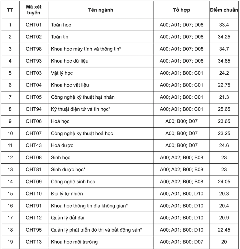 Riêng với 4 ngành: Toán học, Toán tin, Khoa học máy tính và thông tin, Khoa học dữ liệu: Điểm chuẩn tính theo thang điểm 40 là tổng Điểm môn Toán (nhân hệ số 2) cộng với điểm hai môn còn lại trong tổ hợp xét tuyển và cộng với điểm ưu tiên khu vực, đối tượng (nếu có) theo quy định của Bộ Giáo dục và Đào tạo (đã quy sang thang điểm 40).