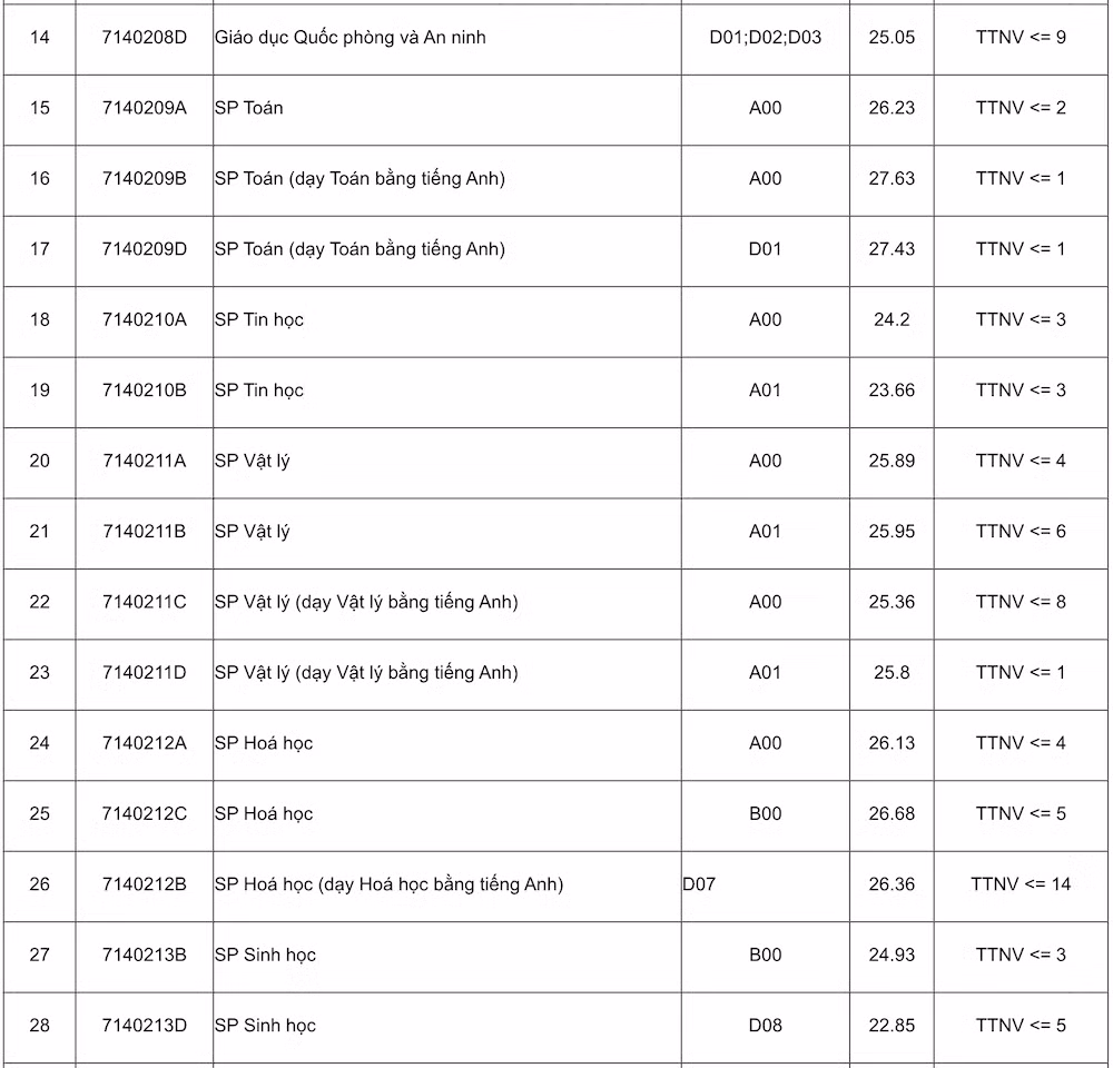 Điểm chuẩn của Trường đại học Sư phạm Hà Nội năm 2023 đối với các ngành đào tạo giáo viên (thang điểm 30) như sau: