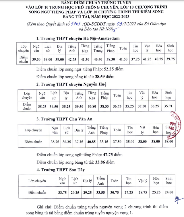 Giám đốc Sở Giáo dục và Đào tạo Hà Nội Trần Thế Cương vừa ký Quyết định duyệt điểm chuẩn trúng tuyển vào lớp 10 trung học phổ thông chuyên, lớp 10 chương trình song ngữ tiếng Pháp và lớp 10 chương trình thí điểm song bằng tú tài năm học 2022-2023.