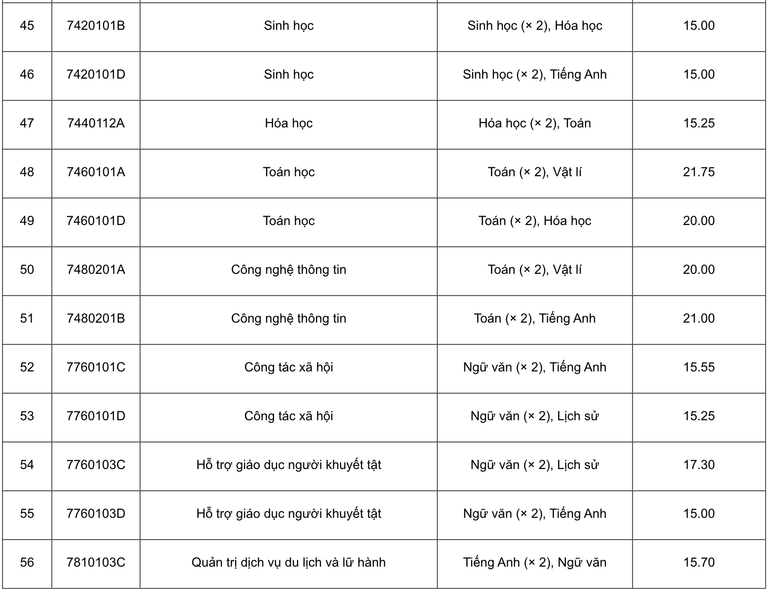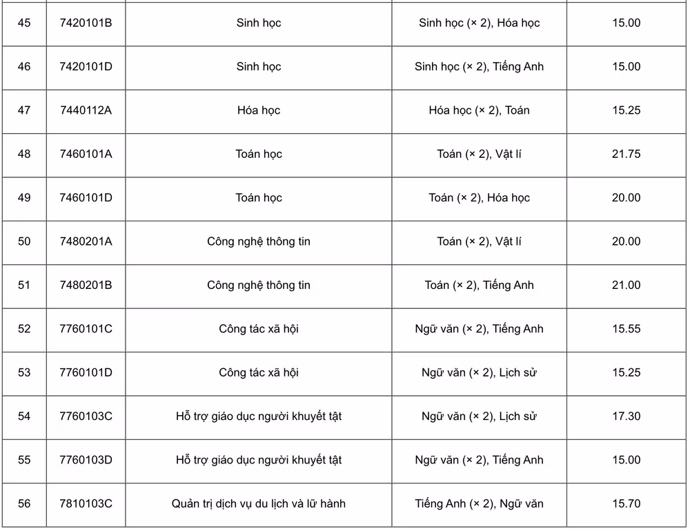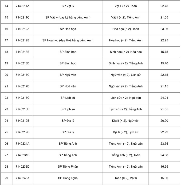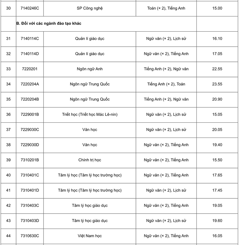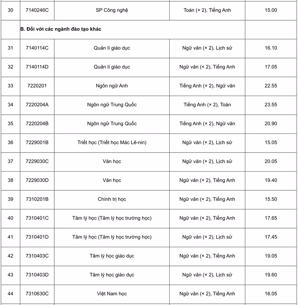 Điểm chuẩn cụ thể từng ngành của Đại học Sư phạm Hà Nội như sau: