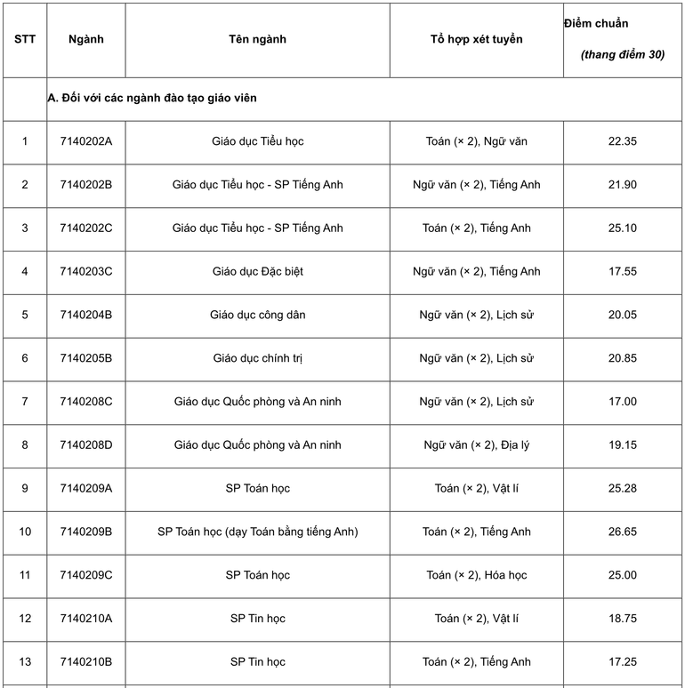 Các ngành đào tạo giáo viên lấy điểm chuẩn từ 15 điểm đến 26,65 và điểm. Ngành Sư phạm Toán (Dạy bằng tiếng Anh) lấy điểm chuẩn cao nhất, ở mức 26,65 điểm. Đây cũng là ngành duy nhất có điểm chuẩn trên 26.