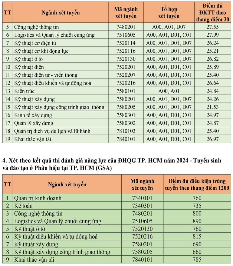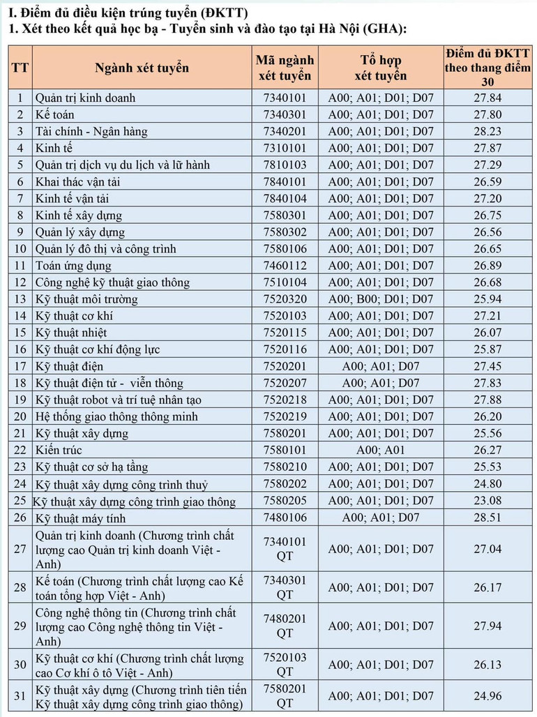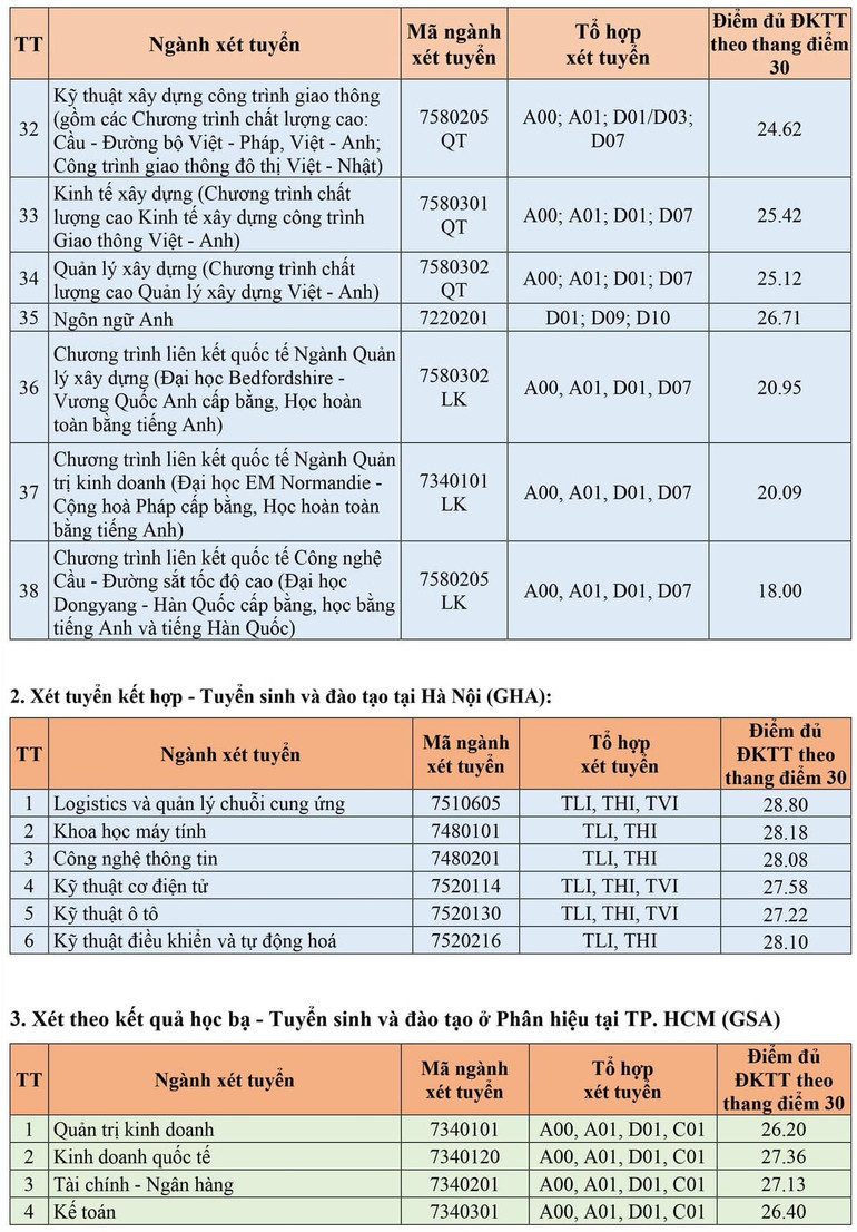 Điểm chuẩn xét tuyển sớm năm 2024 của Trường đại học Giao thông vận tải của từng ngành như sau: