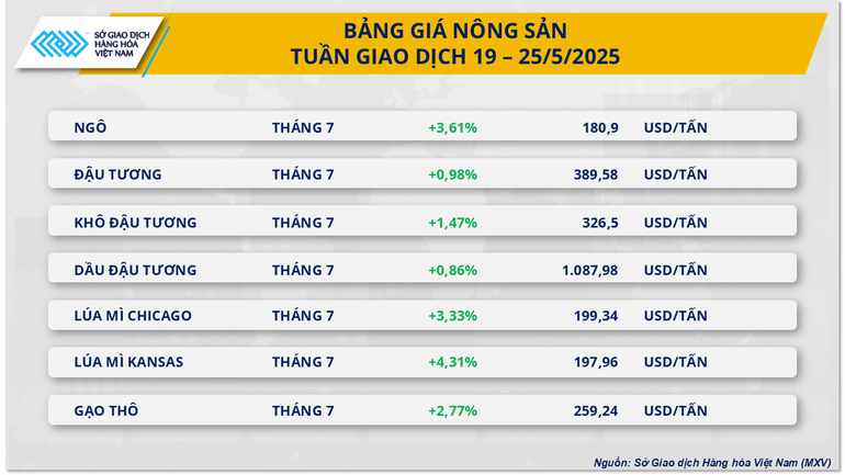 Đóng cửa tuần giao dịch vừa qua (19-25/5), tâm lý tích cực tiếp tục được duy trì trên thị trường nông sản khi toàn bộ 7 mặt hàng trong nhóm đồng loạt tăng giá. Trong đó, giá đậu tương tăng gần 1% lên mức 389 USD/tấn, đánh dấu tuần tăng đầu tiên sau ba tuần giảm liên tiếp. Theo MXV, diễn biến giá tuần qua phản ánh đà phục hồi ổn định, khi thị trường cân nhắc lại rủi ro nguồn cung từ Nam Mỹ, đồng thời lực mua kỹ thuật và kỳ vọng vào các chính sách hỗ trợ của Mỹ tiếp tục duy trì tâm lý tích cực.