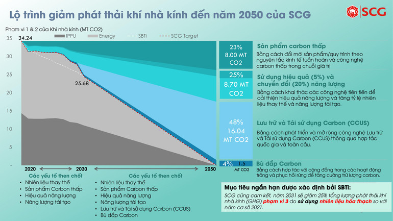 Bên cạnh đó, ngành kinh doanh Xi măng - Vật liệu xây dựng (CBM) của SCG đã áp dụng quy trình sản xuất xanh theo các nguyên tắc tuần hoàn. Đơn cử như sáng kiến sử dụng năng lượng sinh khối để thay thế cho 30% nhiên liệu hóa thạch, đồng thời triển khai công nghệ mới để tăng độ bền của sản phẩm. Công ty cũng lắp đặt hệ thống thu hồi nhiệt thải (Waste Heat Recovery) khắp các nhà máy nhằm đáp ứng 30% nhu cầu sử dụng năng lượng tái tạo, giúp giảm 20% lượng phát thải carbon so với xi-măng thông thường. Trong đó, Tập đoàn PRIME (thành viên của SCG) đang thực hiện hàng loạt cải tiến trong sản xuất, bao gồm việc thay thế xe nâng chạy bằng dầu diesel thành xe nâng điện, tận dụng năng lượng mặt trời và chuyển đổi nhiên liệu từ than sang sinh khối. Thông qua những sáng kiến xanh này, các công ty thành viên của SCG đang tích cực đóng góp cho mục tiêu thiết lập chuỗi sản xuất bền vững của NAPCE.