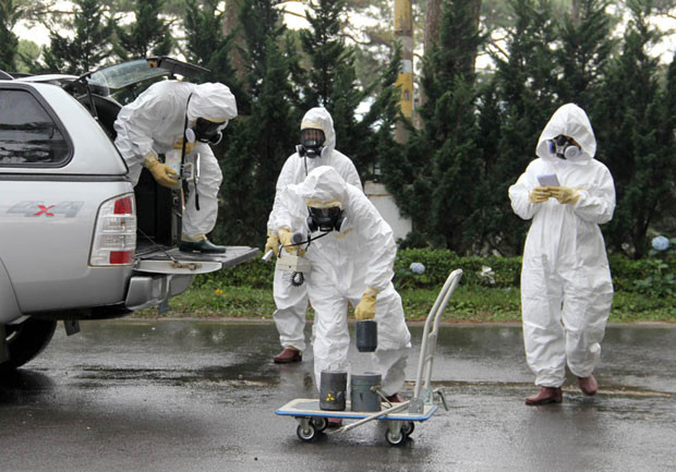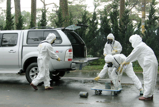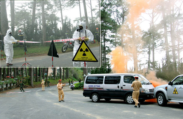 Tình huống giả định, một xe chuyên dụng vận chuyển hai nguồn phóng xạ kín Ir-192, hoạt độ 80 Ci, trên xe có hai người, gồm lái xe và nhân viên áp tải nguồn phóng xạ. Khi xe đang tham gia giao thông thì va chạm xe khách đi ngược chiều, khiến hai người trên xe chở nguồn phóng xạ bị thương nặng, kẹt trong xe. Xe vận chuyển nguồn phóng xạ phát cháy và nguồn phóng xạ rơi ra khỏi hộp chứa.