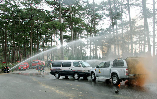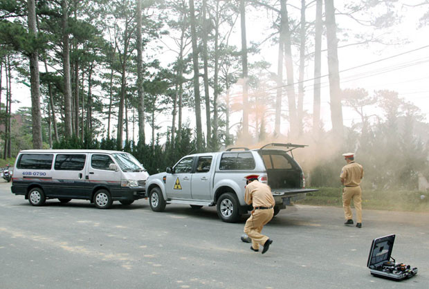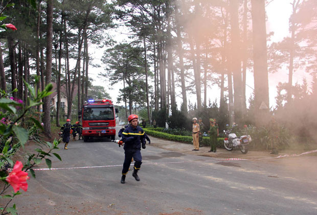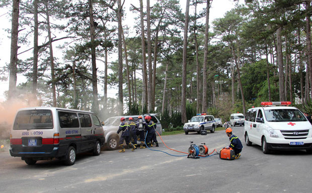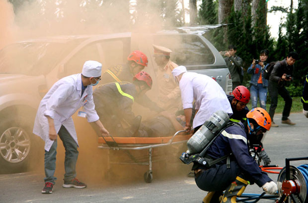 Nhận thông tin, lực lượng Cảnh sát giao thông, PCCC đã đến hiện trường thiết lập vành đai an toàn, bảo đảm an ninh trật tự trong quá trình ứng phó. Sau khi nhận được chỉ đạo của ban chỉ huy, các lực lượng liên quan triển khai các phương án ứng phó sự cố, cô lập và có biện pháp thu hồi nguồn phóng xạ, bảo đảm an toàn cho người ứng cứu, nhân dân và tránh gây ô nhiễm môi trường. Cùng lúc, một bộ phận phân luồng giao thông, triển khai phương án cứu người, chữa cháy; xe cứu thương được điều đến cứu người bị nạn. Sau khi đám cháy được dập tắt hoàn toàn, ban chỉ huy chỉ đạo bộ phận đánh giá và bảo vệ bức xạ nhanh chóng tác nghiệp thu hồi nguồn phóng xạ và lưu giữ bảo đảm an toàn, an ninh; cung cấp thông tin kịp thời cho nhân dân và truyền thông về quá trình ứng phó sự cố.