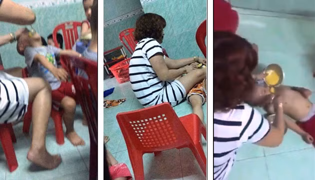 Một đoạn clip khác cho thấy có một bé cũng bị đè nằm ngửa giữa nhà, cô dùng chân gác ngang người để kẹp lại cho ăn mặc cho bé vùng vẫy. Hầu hết những em bé trong clip và ảnh khi ăn đều không được mặc áo.