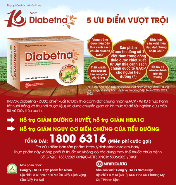 | Diabetna - Sản phẩm được tin dùng số 1 Việt Nam cho người tiểu đường (Theo bình chọn của bạn đọc Tạp chí Kinh tế Việt Nam và người tiêu dùng năm 2020, 2021, 2022). |
