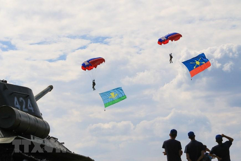 Các vận động viên nhảy dù mang cờ truyền thống của các quân binh chủng trong lực lượng vũ trang Nga tới thao trường Alabino. (Ảnh: Trần Hiếu/TTXVN)