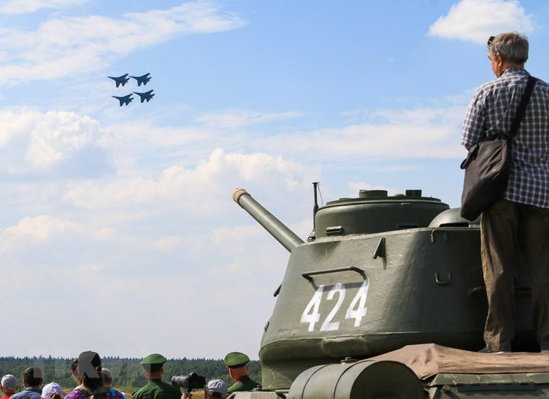 Biên đội Su-35S trình diễn trước giờ khai mạc Army Games 2022. (Ảnh: Trần Hiếu/TTXVN)