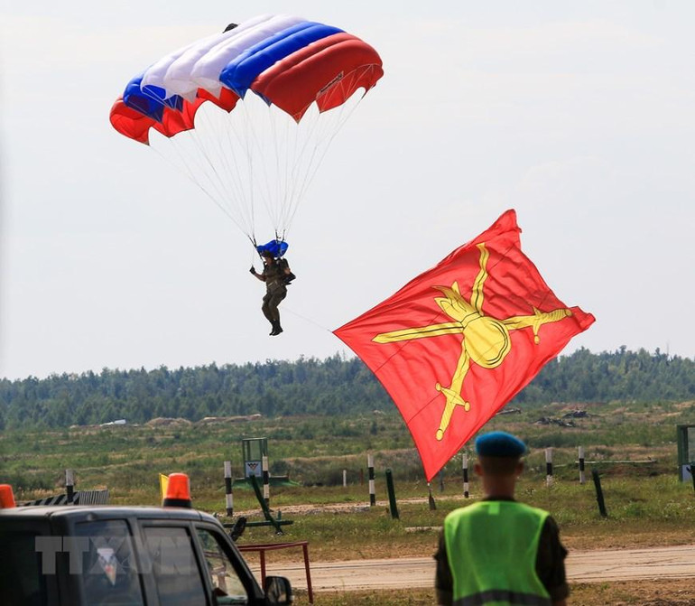 Vận động viên nhảy dù đưa cờ Army Games xuống thao trường Alabino. (Ảnh: Trần Hiếu/TTXVN)