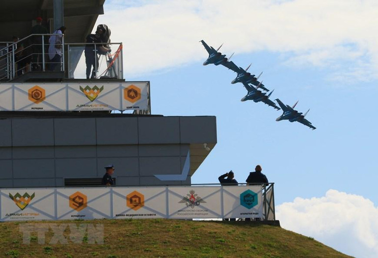 Biên đội Tráng sĩ Nga trình diễn kỹ thuật lái máy bay trước giờ khai mạc Army Games. (Ảnh: Trần Hiếu/TTXVN)