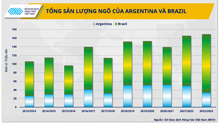 Vài tháng tới hoạt động gieo trồng Nam Mỹ sẽ diễn ra, trọng tâm của thị trường dần chuyển sang mùa vụ của Brazil và Argentina. Mùa vụ Argentina khôi phục sau đợt hạn hán nghiêm trọng năm ngoái. USDA dự báo sản lượng ngô của nước này sẽ đạt 54 triệu tấn, so mức 34 triệu tấn trong niên vụ 22/23.