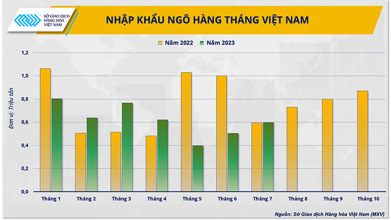 Theo Tổng cục Hải quan, nhập khẩu ngô của nước ta trong 7 tháng năm 2023 đạt gần 4,28 triệu tấn, giảm 16,8% so cùng kỳ năm ngoái. Tuy nhiên, tính riêng trong tháng 7, khối lượng nhập khẩu đạt gần 597.440 tấn, tăng 18,2% và cao hơn so tháng 7/2022. Hoạt động mua hàng đẩy mạnh có thể từ tâm lý lo ngại của các doanh nghiệp do 3 năm khó khăn qua giá nông sản đều có xu hướng hồi phục hoặc tăng mạnh vào cuối năm.