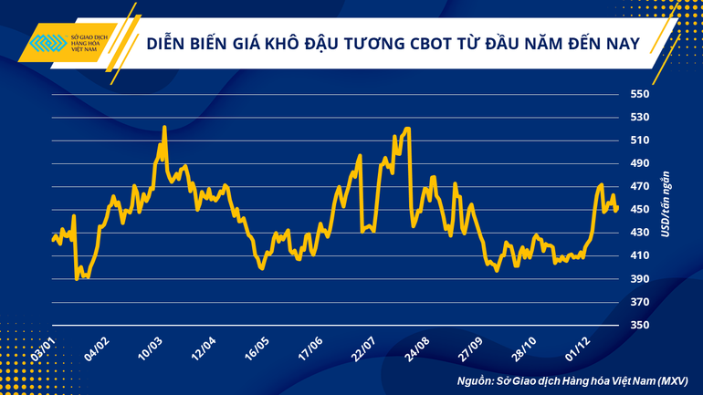 Theo Sở Giao dịch Hàng hóa Việt Nam (MXV), kết thúc phiên 20/12, giá khô đậu tương Chicago đóng cửa ở mức 452 USD/tấn. Trong khi giá 2 loại nông sản khác là ngô và lúa mì đã sụt giảm đáng kể từ đầu quý IV, thì giá khô đậu tương mới chỉ có dấu hiệu hạ nhiệt hơn trong vài phiên gần đây. Trước đó, vào đầu tháng 12, thị trường chăn nuôi đã không khỏi bất ngờ và lo lắng trước chuỗi tăng liên tiếp của mặt hàng này.