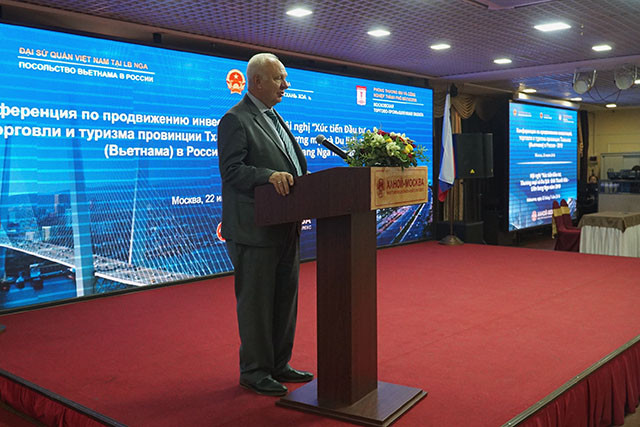 Về phần mình, Phó Chủ tịch phòng Thương mại và công nghiệp thành phố Moscow Suren Vardanyan cho biết, Moscow đặc biệt quan tâm phát triển hợp tác với Việt Nam nói chung và tỉnh Thanh Hoá nói riêng, trước hết trong các lĩnh vực kinh tế, thương mại, y tế, du lịch, năng lượng tái tạo, đào tạo nghề… Ông cũng cảm ơn Chính phủ Việt Nam luôn hỗ trợ các hoạt động xúc tiến, thúc đẩy thương mại và đầu tư, đồng thời đánh giá cao vai trò kết nối của Tổ hợp Incentra và khẳng định chưa có quốc gia nào có một cơ sở đa chức năng lớn như Incentra của Việt Nam tại Moscow.