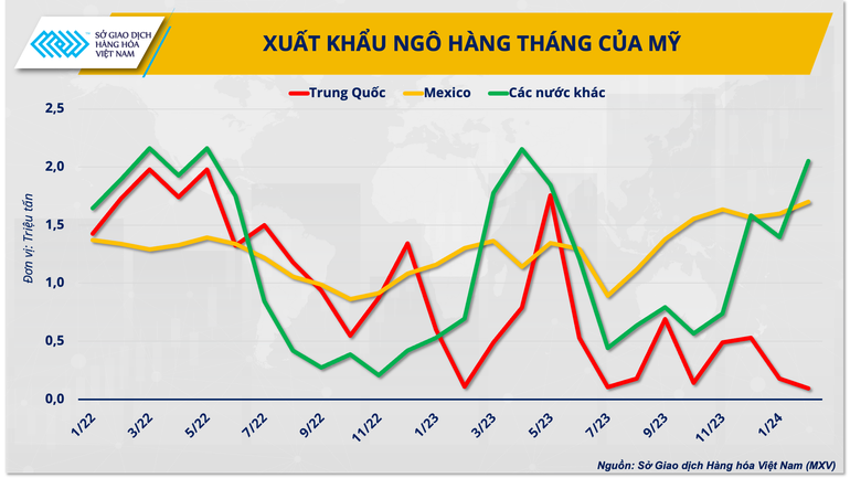 Theo MXV, đây là lý do vì sao thời gian gần đây, Trung Quốc lại nhập khẩu số lượng lớn ngô, đặc biệt là khi quốc gia này đang dần tự chủ về nguồn cung trong nước nhằm giảm sự phụ thuộc vào nước ngoài. Theo một nguồn tin của MXV, hai tháng đầu năm nay, tổng lượng ngô nhập vào nước này đã giảm tới hơn 18%, từ mức 5,3 triệu tấn cùng kỳ năm 2023.