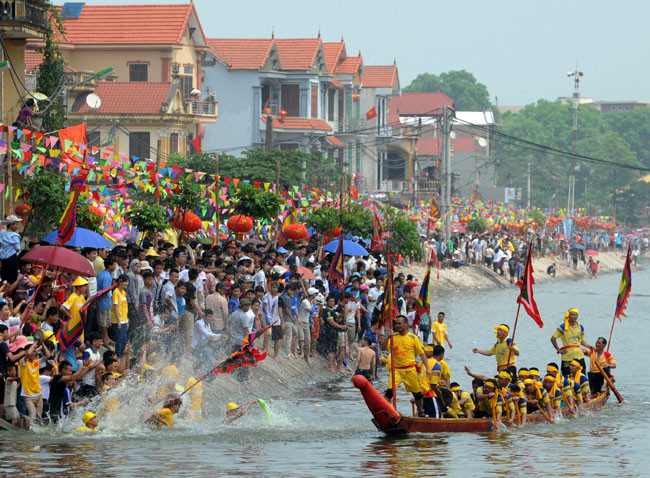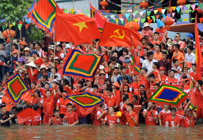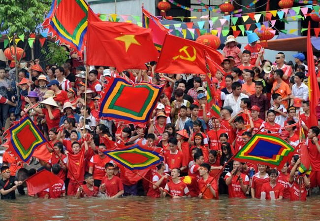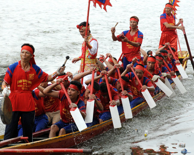 Thuyền mỗi thôn có biểu tượng riêng và trai bơi mang sắc phục khác nhau.