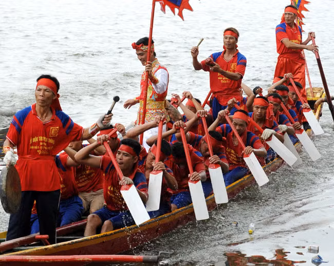 Mỗi đội thuyền đua có 25 người gồm 18 đô bơi, 1 ông đánh mõ, 1 ông lái chính, 1 ông lái phụ, 1 ông phất cờ...