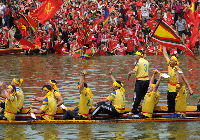 CĐV ở ba thôn cổ vũ cho thuyền đua làng mình.