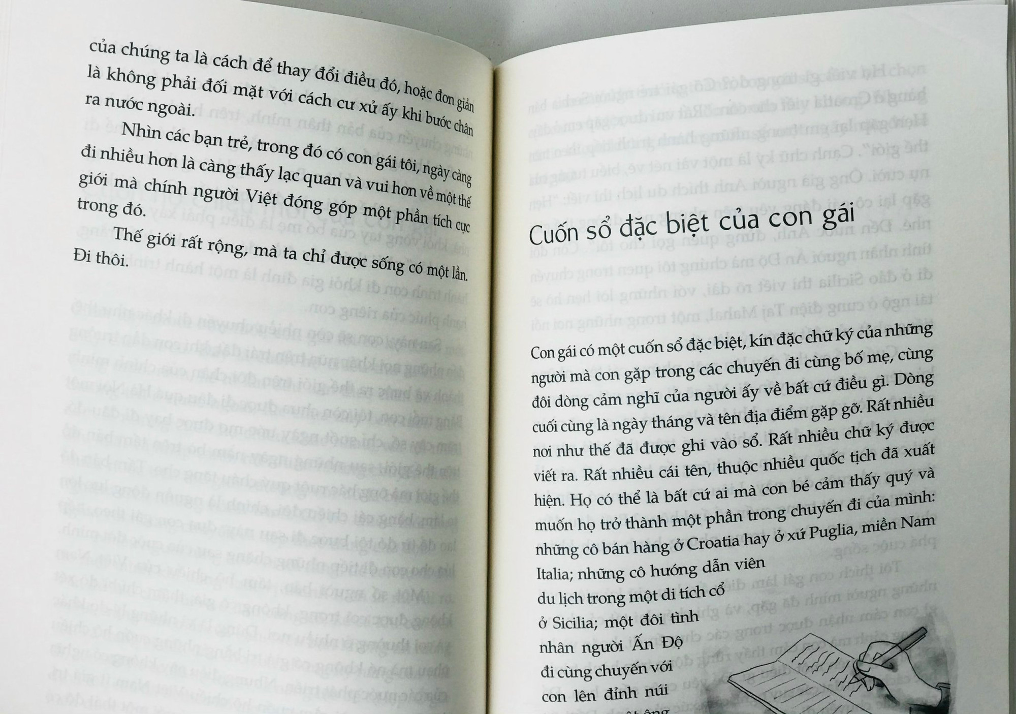 Đi cũng là cách dạy con gián tiếp, hiệu quả về những bài học cuộc sống. Chi tiết cuốn sổ đặc biệt của con gái tác giả kín chữ ký và những dòng cảm nghĩ của những người mà cô bé gặp trên khắp những chuyến đi là một chi tiết thú vị.