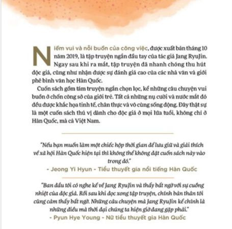 “Niềm vui và nỗi buồn của công việc” do Đặng Lam Giang chuyển ngữ, Nhà xuất bản Trẻ ấn hành cuối năm 2022. Cuốn sách gồm 8 truyện được viết giản dị, chân thành nhưng đầy lôi cuốn về đời sống công sở, không khí xã hội mà giới trẻ Hàn Quốc, cũng là giới trẻ hôm nay đang hít thở, chật vật đi qua. Sự tinh tế, sống động và lối kể điềm đạm của Jang RyuJin có lẽ đã kéo độc giả đi hết trang sách cuối cùng.