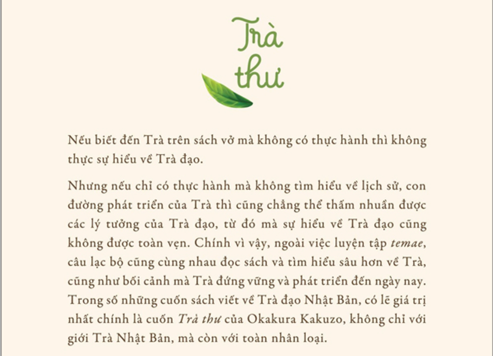 Đâu đó, qua những trang sách, trà để lại những ngẫm ngợi như hậu vị khó tả của chén trà ngon: “Trong ngôn ngữ dân dã, chúng tôi coi một người “thiếu Trà” khi anh ta không cảm nhận được sự hấp dẫn nửa bi nửa hài trong tấn kịch của con người. Và ngược lại, những kẻ theo chủ nghĩa duy mỹ chưa bị khắc chế-bất chấp cái bi kịch của đời sống trần tục-sống buông thả theo cảm xúc là người có “quá dư Trà”.