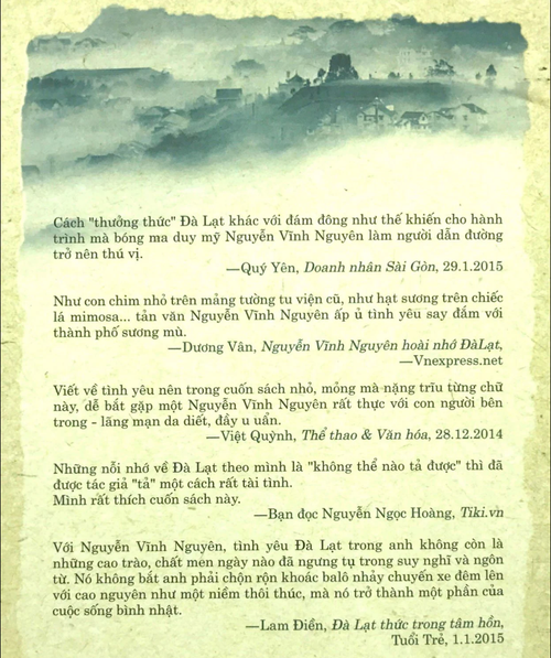 Có chừng 24 bài viết, khi dài mà cũng có khi vẻn vẹn những đoản văn vốn là những ghi chép từ sổ tay, nay bước vào trang sách. Nhưng dài hay ngắn, tâm tình của Nguyễn Vĩnh Nguyên vẫn hướng về Đà Lạt trong từng nhịp đời sống của mình.
