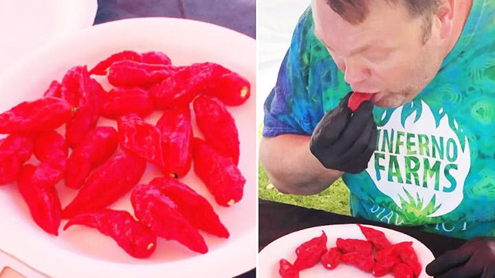 Một người có khả năng ăn cay nổi tiếng ở California (Mỹ) đã phá kỷ lục Guinness thế giới khi ăn 17 quả ớt loại cay nhất thế giới (trong ảnh) chỉ trong một phút. Gregory Foster đã ăn loại ớt có tên Bhut Jolokia, còn được gọi là ớt ma, được ghi nhận là loại ớt cay nhất thế giới. Theo UPI, Foster cũng nhiều lần được biết đến với sở thích đặc biệt này khi thắng cuộc trong cuộc thi ăn ớt cay ở bang California.
