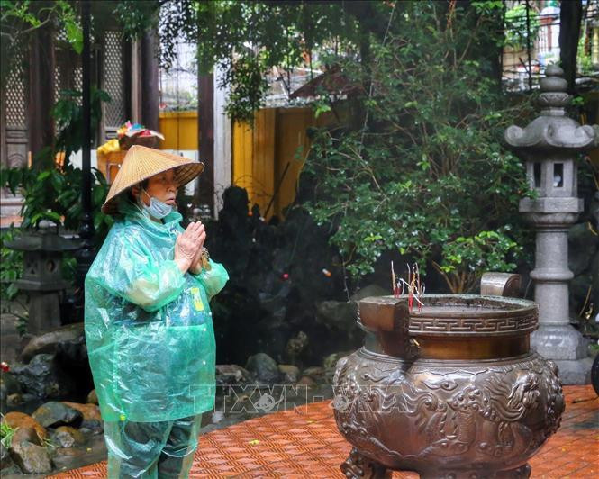 | Người dân thành tâm cầu khấn tại chùa Quán Sứ dù trời mưa to. |