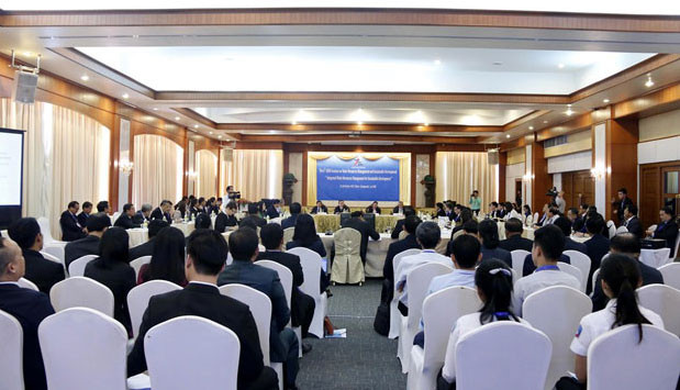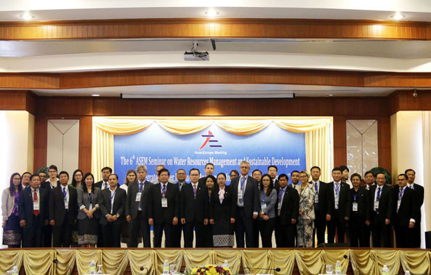 Đại sứ Việt Nam tại Lào Nguyễn Bá Hùng (thứ ba bên phải) cùng các đại biểu tham dự lễ khai mạc Đối thoại ASEM lần thứ 6 về quản lý nguồn nước và phát triển bền vững, sáng 25-10.