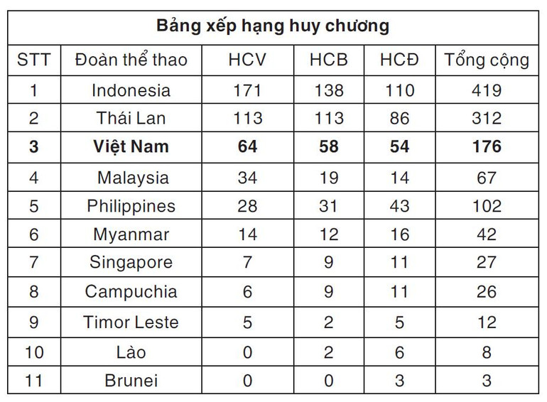 Ở môn điền kinh, Ban tổ chức đã bố trí thi đấu các nội dung tiếp sức và đội tuyển điền kinh Việt Nam giành thêm một HCĐ. Như vậy, khép lại các nội dung điền kinh, các VĐV nước ta giành được 15 HCV, 22 HCB và 14 HCĐ. Xếp sau đoàn chủ nhà (37 HCV) và đoàn Thái Lan (22 HCV).