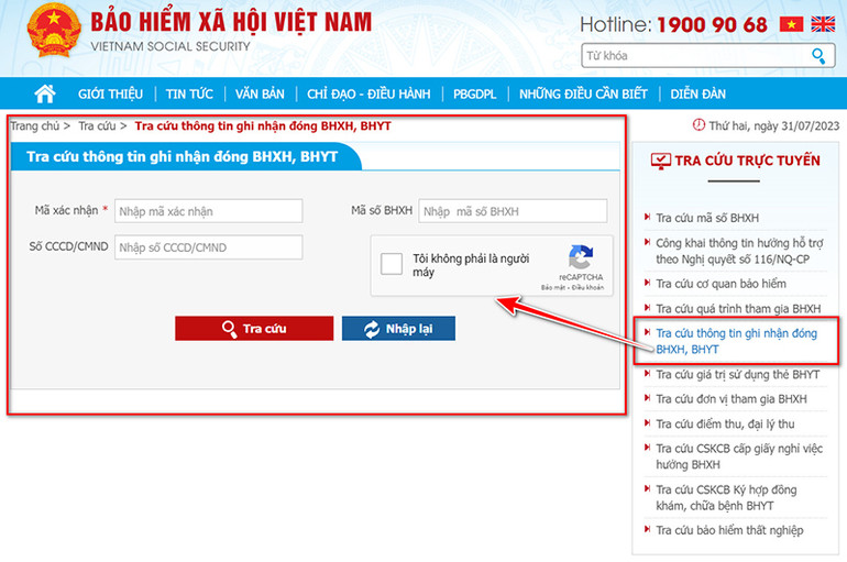 Bước 3: Chọn chức năng Tra cứu thông tin ghi nhận đóng bảo hiểm xã hội, bảo hiểm y tế